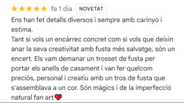 Tant si vols un encàrrec concret com si vols que deixin anar la seva creativitat amb fusta més salvatge, són un encert. Els vam demanar un trosset de fusta per portar els anells de casament i van fer quelcom preciós, personal i creatiu amb un tros de fusta que s'assemblava a un cor. Són màgics i de la imperfecció natural fan art❤️ -