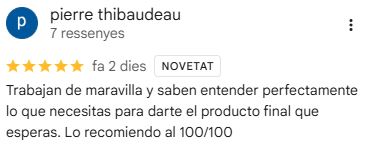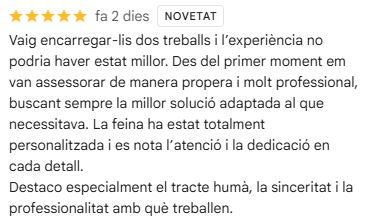Vaig encarregar-lis dos treballs i l’experiència no podria haver estat millor. Des del primer moment em van assessorar de manera propera i molt professional, buscant sempre la millor solució adaptada al que necessitava. La feina ha estat totalment personalitzada i es nota l’atenció i la dedicació en cada detall.