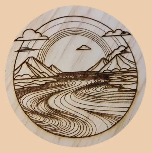 Paissatge amb muntanyes, riu i un cel nuvolat